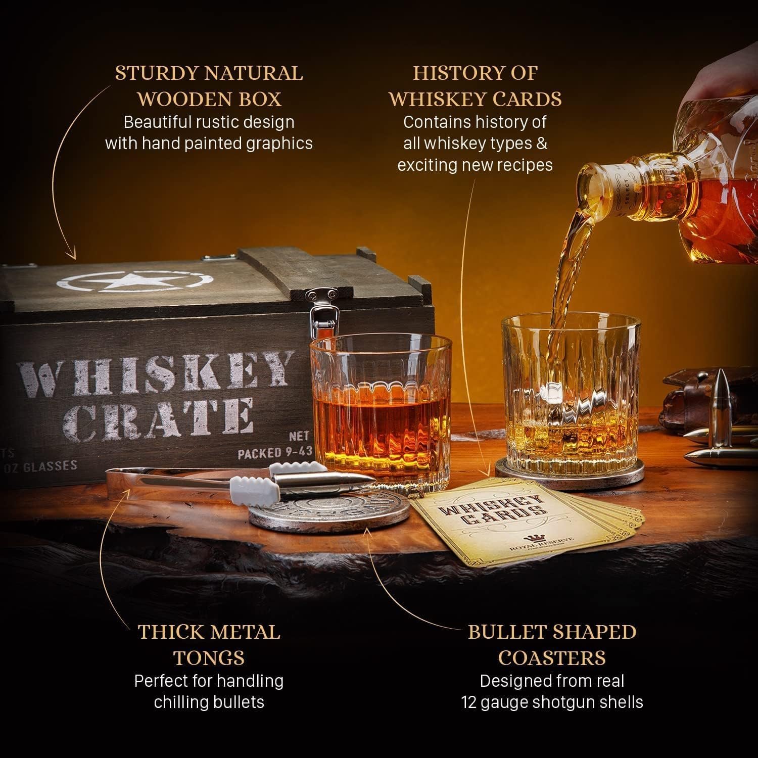 Bullet Whiskey Stones Gift Set by Royal Reserve | Artisan Crafted Whiskey Glasses, Coasters, Whiskey Crate – Christmas Whiskey Gifts for Men Husband Dad Boyfriend Ranger Hunter