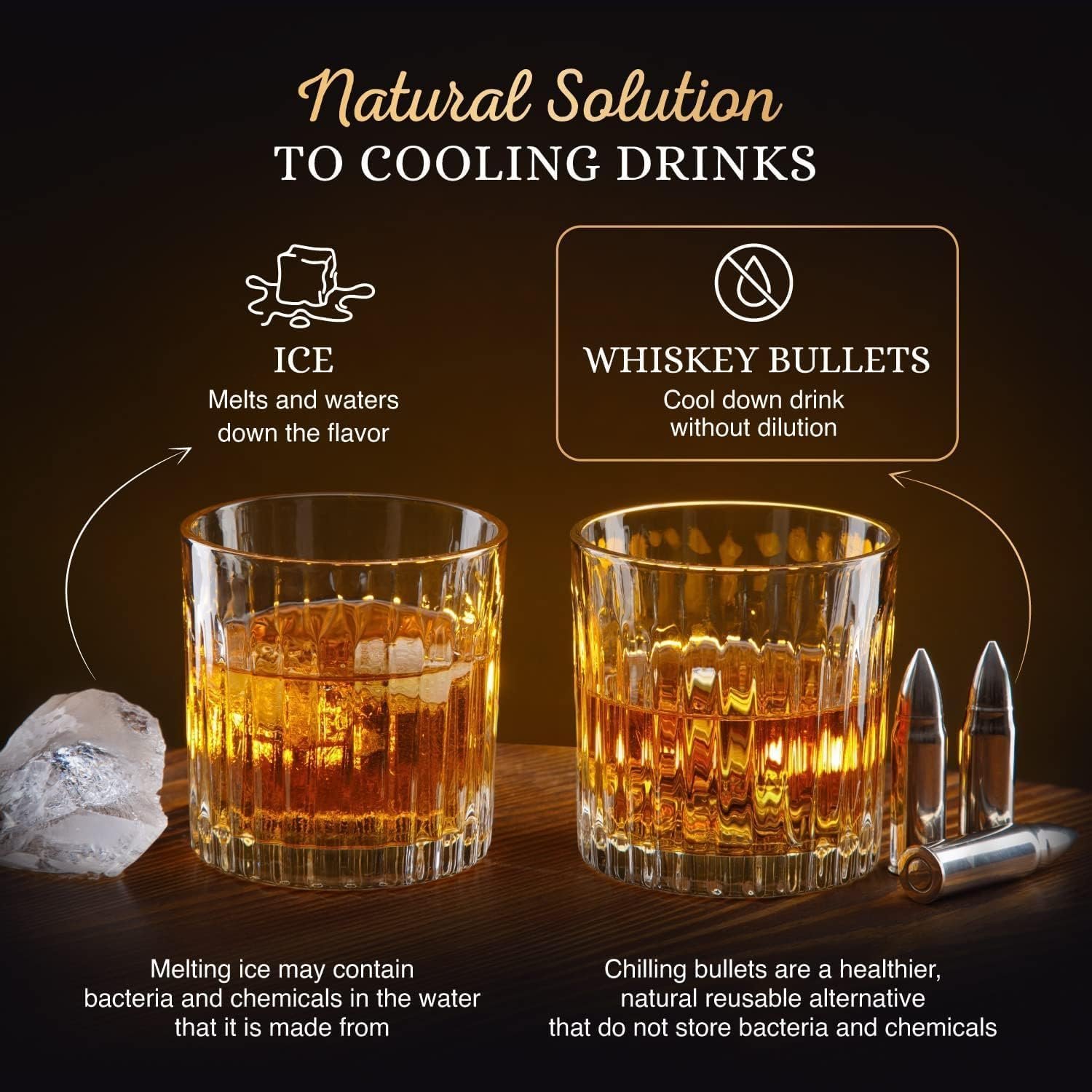 Ice Alternative: Made from polished stainless steel, our bullet ice cubes offer a cooling solution without dilution, ensuring the integrity of your drink. Non-porous, odorless, and polished for smoothness, they won’t scratch delicate whiskey glasses.