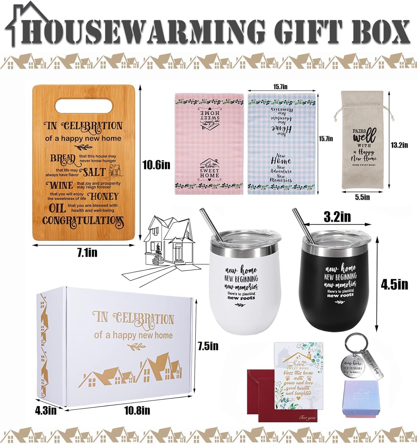 【House Warming Gifts New Apartment】We have the most popular and practical housewarming gifts in a housewarming gift box. Our housewarming gift baskets include bamboo boards, 2 tumblers, wine bags, keychains, towels and cards. Each is professionally designed and crafted. Gifts do not need to be repackaged. Send it directly to your family or friends who have moved into a new house.