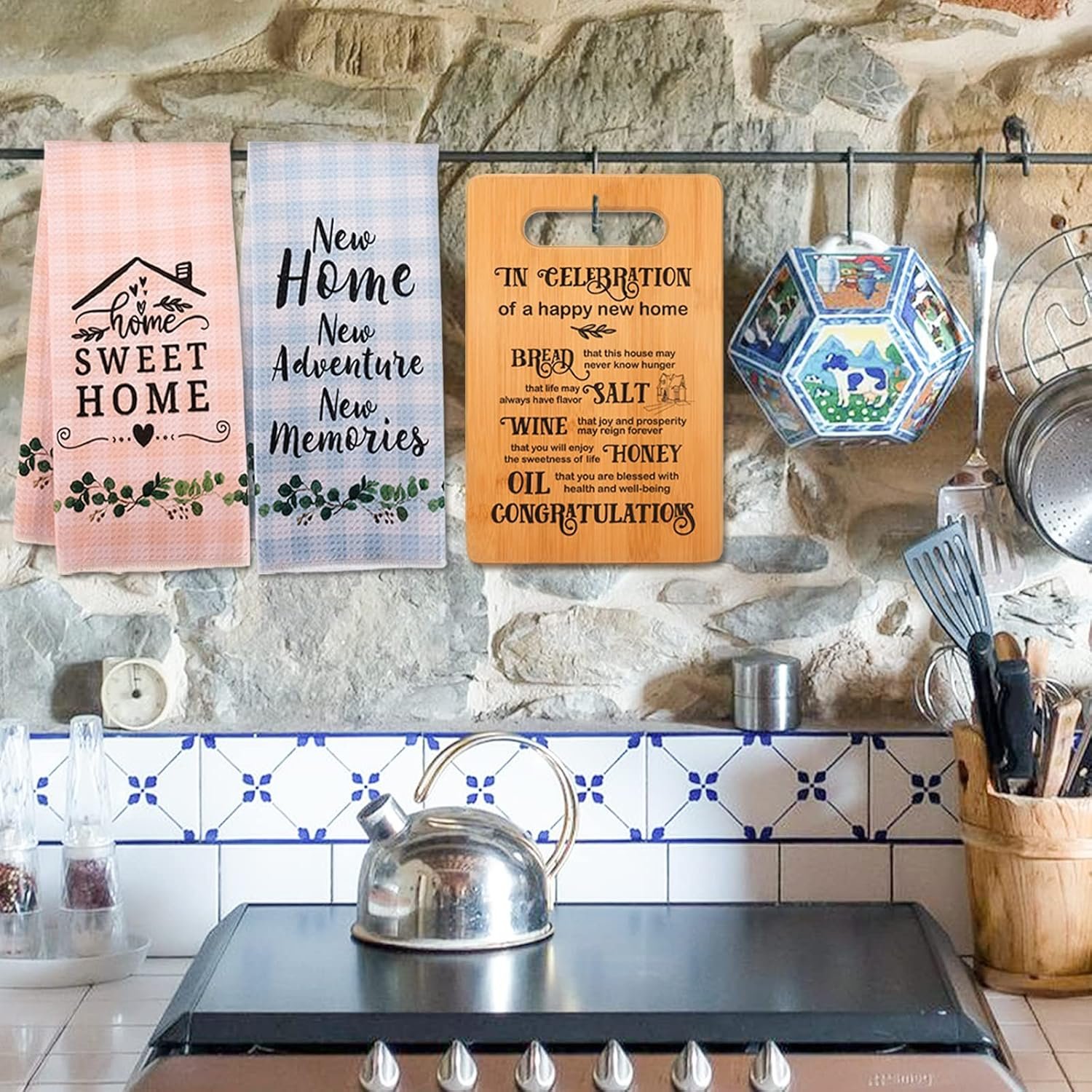 【Cute Welcome Home Decorations】We have years of valuable experience with housewarming gifts decor. These saying words printed on our gift items are the most popular at present. They express your best wishes for the new home owner. Our bamboo boards and towels are the perfect accessories to decorate your new home kitchen. They will evoke the joy of their new home, while also remembering you and your beautiful blessings.