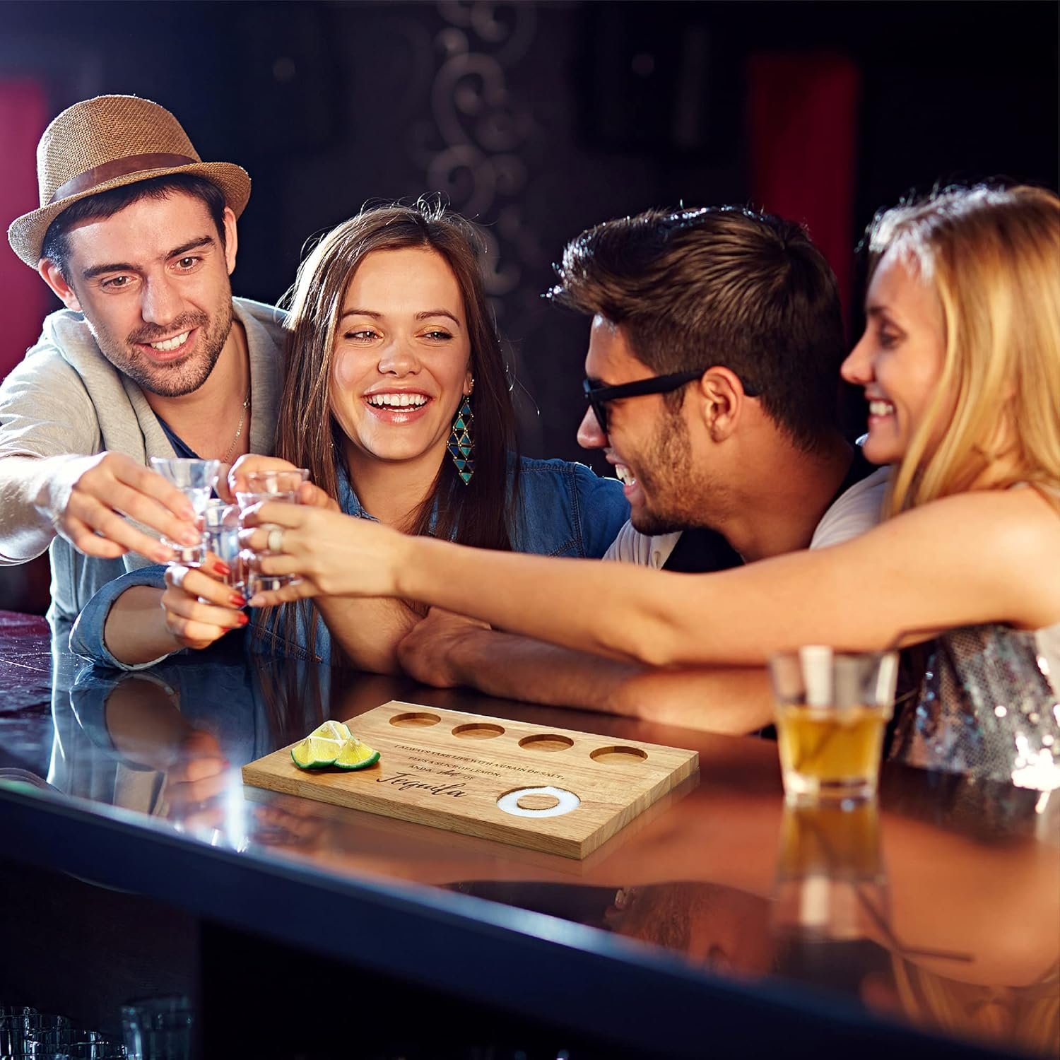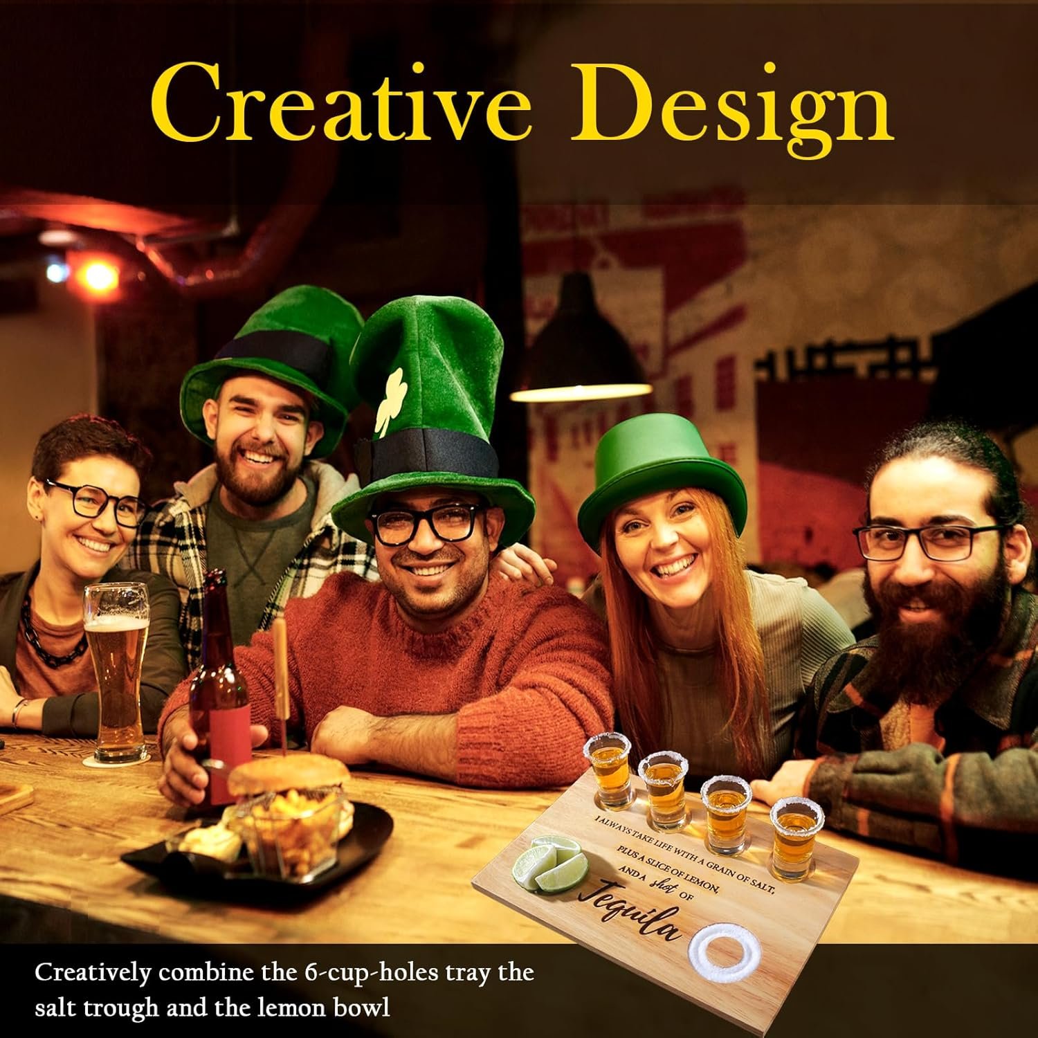 Delicate Design:You will receive 1 piece of tequila shot board(glassware is not included), which is printed unique saying.Creatively combine the 4-cup-holes tray, the salt trough, and the lemon bowl together!