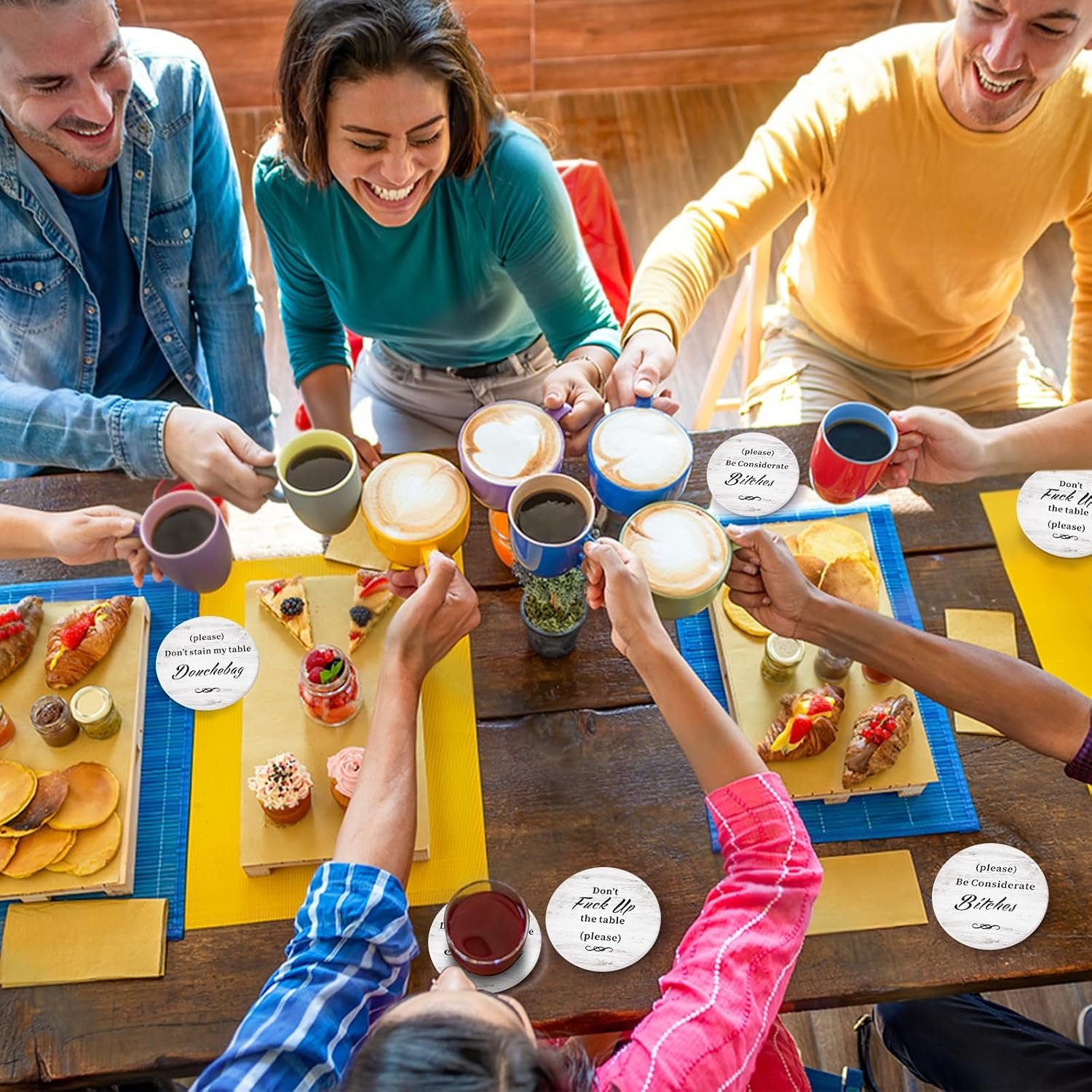 When you host with these coasters, we’re very sure that nobody will use the word “boresome” to describe your home. It’s a wonderful way to make people laugh for free while also reminding them to keep their beverages off the table!